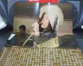 COVER: Cover is partly worn corners & outer-edges of front-lid, while being split short in the top corners of front lid ( See photo ). Spine of front-lid is discolored. Outer rims of back side are scraped. Minor brown spots with light ring-wear are on the front surface. Inside box is clean. Otherwise it has no dent, strip & writing...OK.