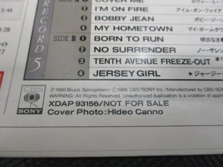 Description: This is scarce Japan PROMO ONLY album ( released in 1986 ) of Bruce Springsteen. OBI & INSERT were not originally issued for this album, because it was made only for promotional use. This is extremely rare item, made as "Special DJ COPY", printed on the back, and released only in Japan beforehand of "LIVE 1975-85 5LP-BOX". The back cover shows “Description (in Japanese)", "Track-list for 5LP-BOX" & "Track-list for this album". Each label of disc is printed as “FOR PROMOTION ONLY” ( See photo ). A track-list revision sticker is on the track-list of back cover. It’s very hard to find this album even in our country. Scarce item from Japan to serious collector.